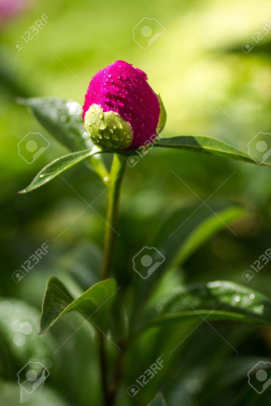 マゼンタ ピンクの牡丹の花芽の心を開く形水滴と太陽の下で花びら の写真素材 画像素材 Image